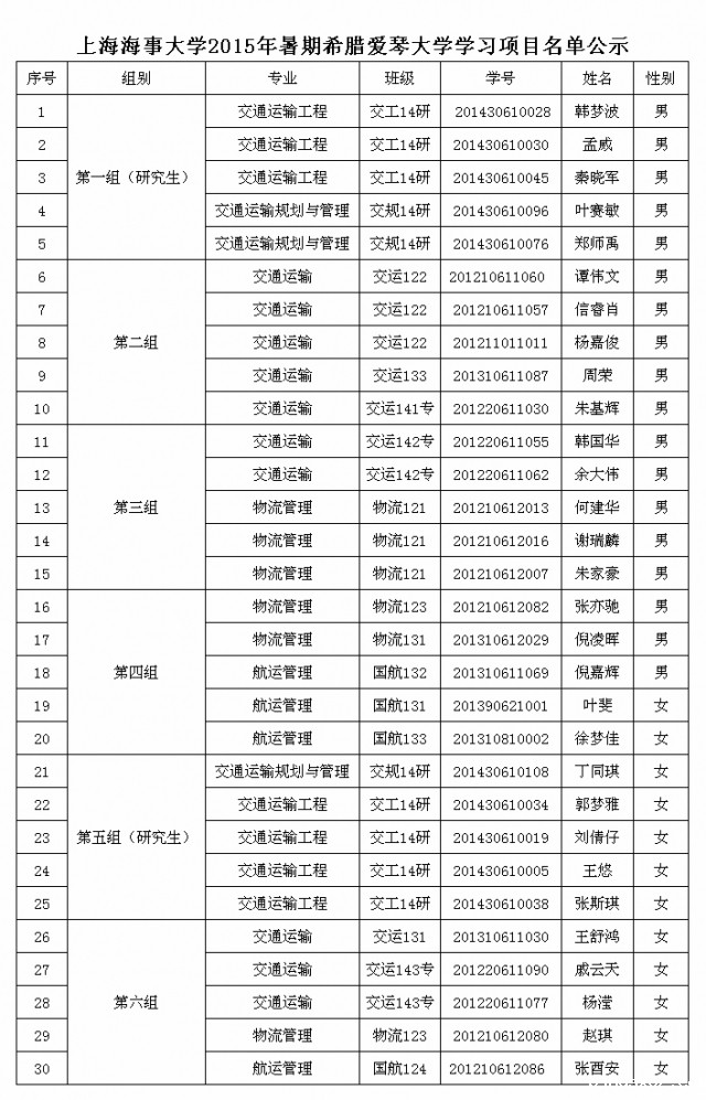 经学院面试,韩梦波等30名同学入选我校2015年希腊爱琴海大学暑期游学项目,现将入选学生名单公示如下: