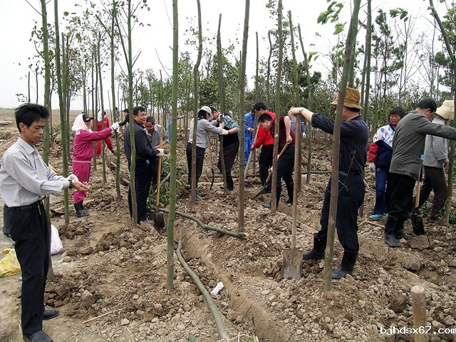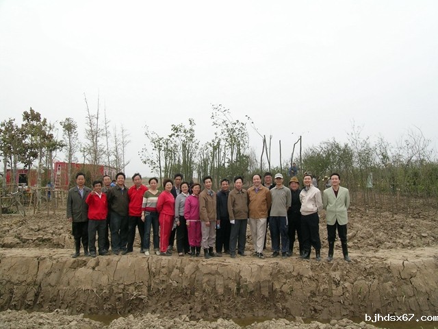 2位年轻人入住此处后,我们又动员了1对农民工夫妻进入苗圃工作。在张永兴的带领下,工作很快有序展开。先完成了苗圃土壤性状的调查,绿化地的精耕,进行了首次施肥和去碱任务。4月中旬,后勤中心组织所有干部加上部分绿化工到现场进行了义务植树,种下了第一批150棵多个品种的实验苗木。在落日的余晖下,原来一片荒芜之地第一次有了生机!