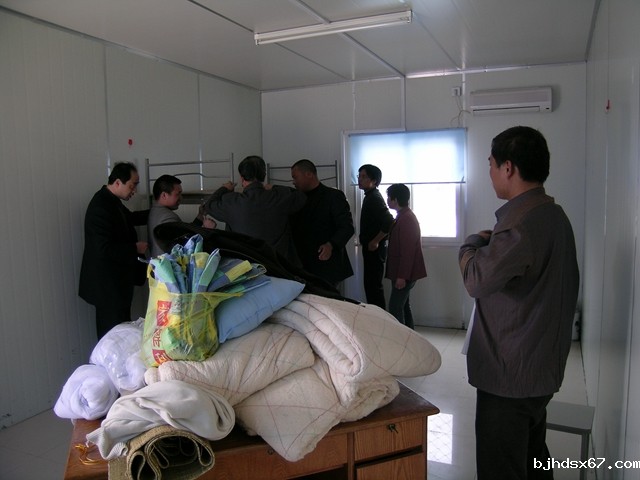 铺下了新校第一张床(图中右一为张永兴、右三为赵志勇)