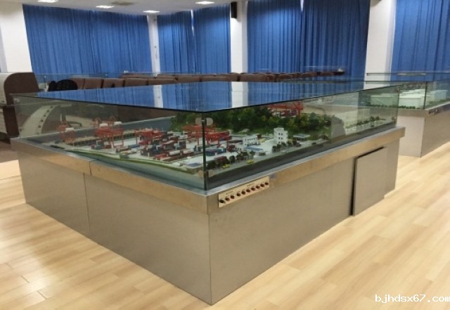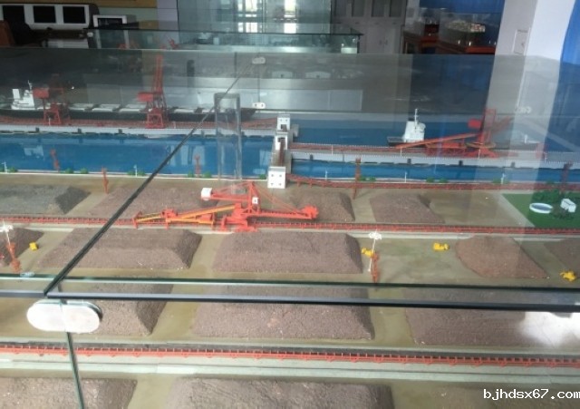 2、港口装卸工艺模拟系统:主要由港口装卸工艺三维动画演示系统和港口装卸工艺沙盘模型两部分组成。港口装卸工艺沙盘模型主要包括内河码头装卸工艺系统、油品码头装卸工艺系统、集装箱码头装卸工艺系统、铁矿石码头装卸工艺系统、件杂货码头装卸工艺系统、散粮码头装卸工艺系统六种码头装卸工艺系统构成(图3、图4、图5、图6、图7、图8所示)。该系统展示了不同货种的装卸工艺机械化系统和工艺流程。港口装卸工艺三维动画演示系统主要演示上述各港口的包括码头平面布置、主要机械设备、货物进出口工艺流程等方面的内容,如图2所示。通过港口装卸工艺三维动画演示系统和港口装卸工艺沙盘模型可以帮助学生形象地了解港口平面布置、港口装卸机械概况和港口装卸工艺的流程,对《港口生产调度模拟实验》、《港口装卸工艺》、《港口概论》等课程的教学起辅助作用。