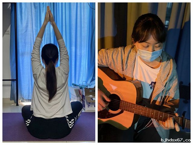 没有专门的舞台,学院学生们以宿舍为单位、以寝室为舞台,在这一番小小天地中发挥自己的特长,培养自己的兴趣,一样为生活增添缤纷色彩,散发如在舞台上一样的光芒。国航201班孙畅便是其中一员,弹着吉他唱着歌,解压与娱乐并行,给寝室生活带去别样的色彩。物流201施仪在寝室也不忘记进行舞蹈动作练习,为线下再一次登台做准备。“自律给我自由”是学生们的信念,学生们调整好自己的生活规律,足不出户也能实现运动达标,瑜伽、杠铃、帕梅拉,深蹲、跳绳、燃脂操,不仅强健了体魄,燃烧了卡路里,更舒缓了焦躁不安的内心。国航186张子琪和国航196崔雨晴专门事先录制好太极拳视频在线上鼓励其他同学一起锻炼。国航196的柯振宇同学也通过录制视频给同学们带来一些在房间就能完成的简易拉伸动作的示范,提醒同学不要疏于锻炼,非常时期大家一起共渡难关。